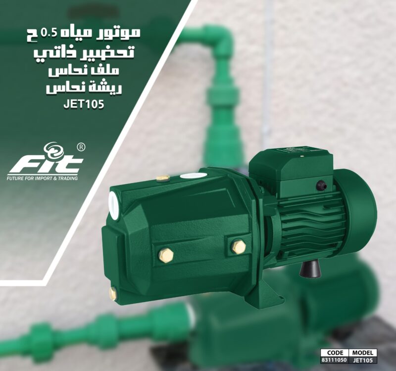ماتور مياه 1 حصان فيت JET105 هو الحل المثالي لضخ المياه بكفاءة واستمرارية في المنازل والشركات. يتميز بتقنية التحضير الذاتي وملفات نحاس عالية الجودة لضمان أفضل أداء وأطول عمر افتراضي.”